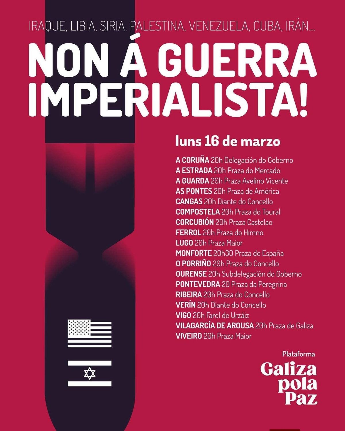 Este luns, 16 de marzo ás 20 h. na Praza da Peregrina concentración contra a guerra imperialista. Organiza: Galiza pola Paz