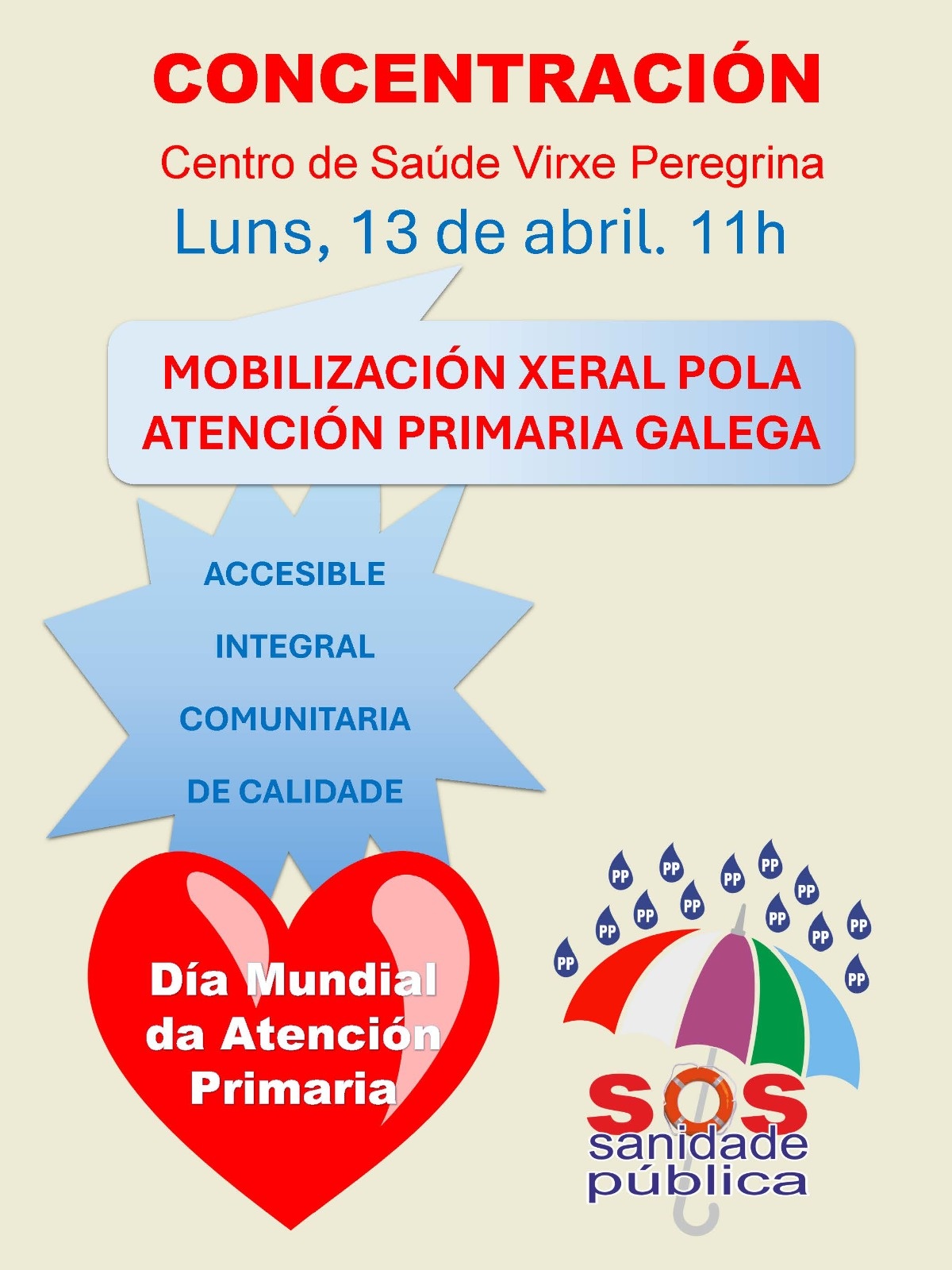 Defende a sanidade pública. Participa este Luns, 13 de abril, na CONCENTRACIÓN convocada por SOS Sanidade Pública ás 11.00 h. no centro de saúde Virxe Peregrina de Pontevedra.